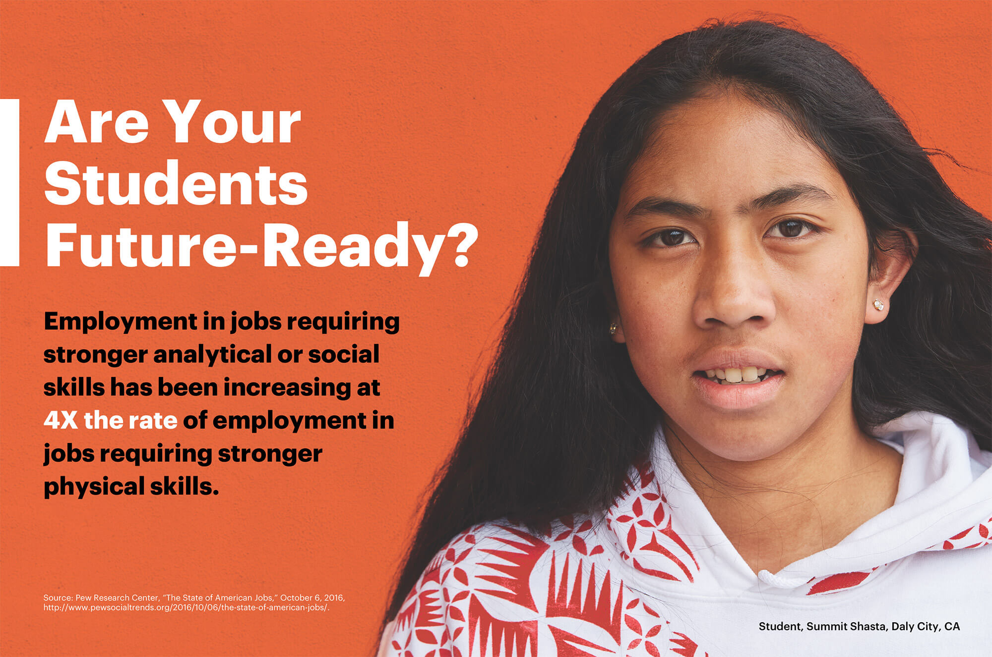 Nearly half of Americans have jobs where at least some tasks can be automated.1 We can’t afford to prepare students for jobs that artificial intelligence (“AI”) and robots can perform just as well, and at a lower cost. In the future, well-paying work will demand the irreplaceable qualities and skills at which humans are still best: the ability to solve unfamiliar problems, create, innovate, connect, empathize, synthesize, and strategize. That’s true even for blue-collar jobs. Over half of American manufacturing firms say that advanced reading skills are needed for core production jobs. Even more, say that the ability to collaborate and work in teams is “very important.”2