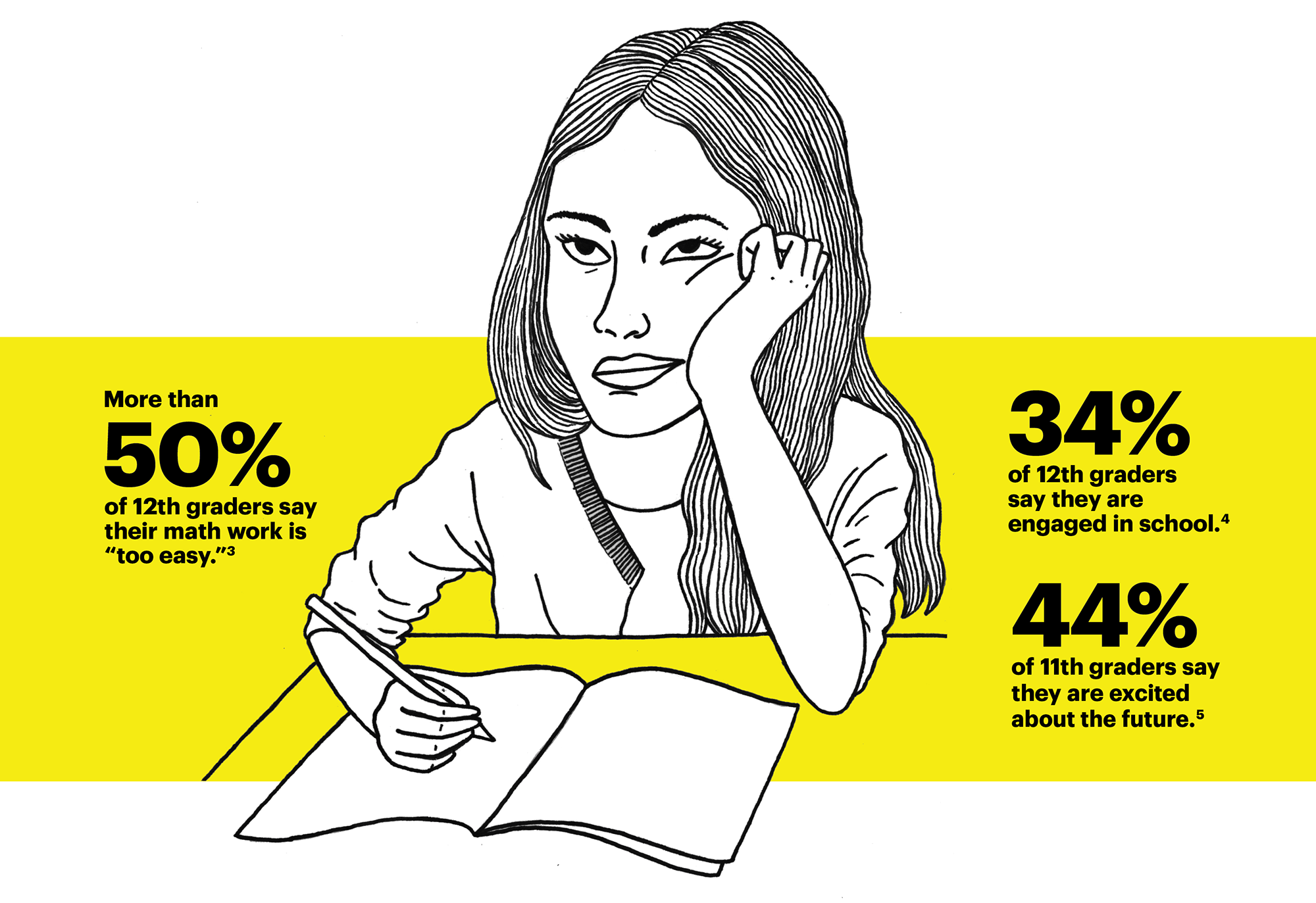 Instead of being challenged to develop their minds, most high school students say they are bored, unchallenged, and uninspired.9 Only half of high school students believe their school has helped them develop the skills and knowledge they will need in college-level classes.10 And less than half of our high school students say their school has helped them figure out which careers match their skills and interests.11